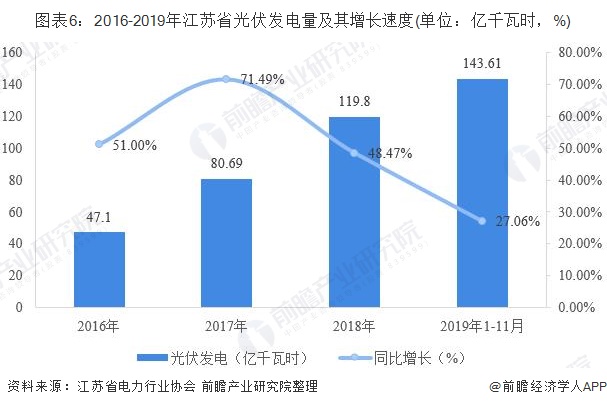 光伏發(fā)電方面,2016-2019年,江蘇省風(fēng)電發(fā)電量高速增長(zhǎng),2016年全省風(fēng)電發(fā)電量?jī)H47.1億千瓦時(shí),到2018年增長(zhǎng)至119.8億千瓦時(shí)。截至2019年11月,全省風(fēng)電發(fā)電量為143.61億千瓦時(shí),同比增長(zhǎng)27.06%,與風(fēng)電發(fā)電量之間的差距進(jìn)一步縮小。