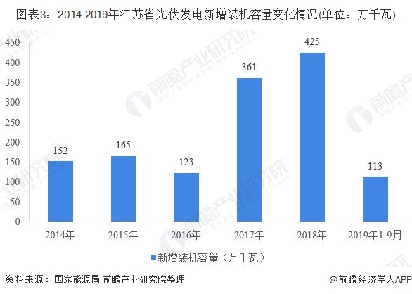 2014年以來,江蘇省光伏新增裝機容量均維持在100萬千瓦以上水平,2017-2018年新增裝機容量更是超過300萬千瓦。受政策變化影響,截至2019年第三季度,江蘇省新增裝機容量為113萬千瓦,較上年下降明顯。