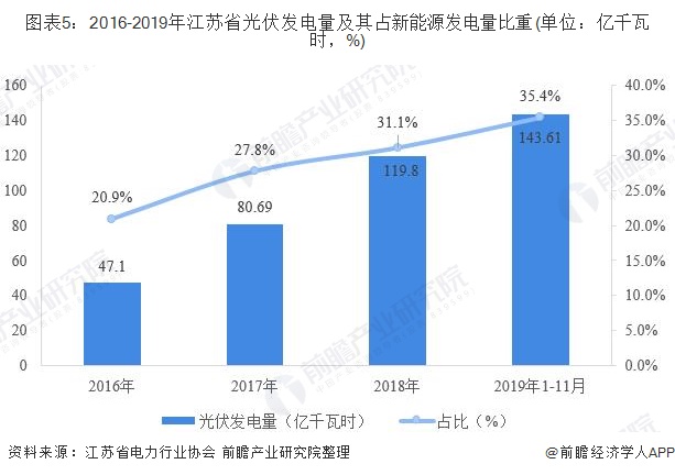 據(jù)江蘇省電力行業(yè)協(xié)會統(tǒng)計數(shù)據(jù)顯示,2016年以來,江蘇省光伏發(fā)電量穩(wěn)步增長,2016年,全省光伏發(fā)電量僅為47.1億千瓦時,到2019年1-11月,已增長至143.61億千瓦時。另外,光伏發(fā)電在江蘇省新能源發(fā)電中的市場份額也在逐步提升,2019年1-11月,江蘇省光伏發(fā)電量占新能源發(fā)電量的比重已提升至35.4%。
