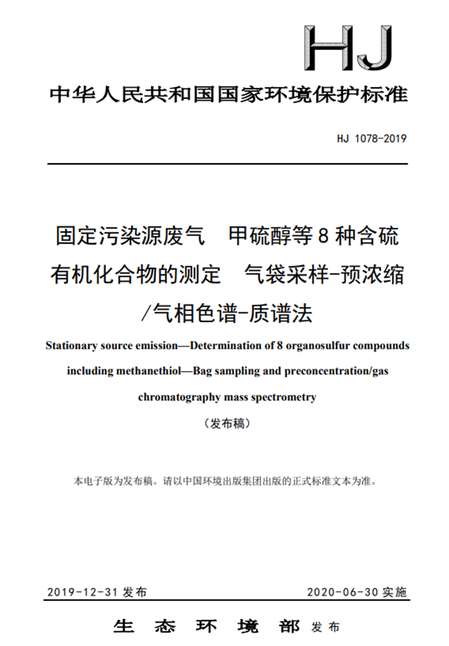 日前,生態(tài)環(huán)境部發(fā)布固定污染源廢氣 甲硫醇等8種含硫有機化合物的測定 氣袋采樣-預濃縮/氣相色譜-質譜法正式稿,2020年6月30日實施,詳情如下: