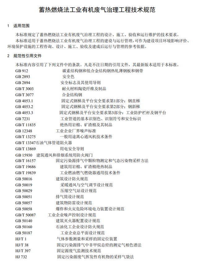 為貫徹《中華人民共和國環(huán)境保護法》《中華人民共和國大氣污染防治法》等法律法規(guī),防治環(huán)境污染,改善生態(tài)環(huán)境質量,規(guī)范工業(yè)有機廢氣治理工程建設和運行管理,制定本標準。本標準規(guī)定了工業(yè)有機廢氣蓄熱燃燒法治理工程的設計、施工、驗收和運行維護的技術要求。本標準為指導性標準。本標準為首次發(fā)布。