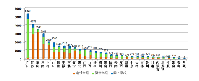 從各地區(qū)不同渠道舉報數(shù)量看,廣東、江蘇、重慶、河南等地舉報量居前,重慶、上海、江蘇等地電話舉報占比較高,廣東、廣西、浙江等地微信舉報占比較高。