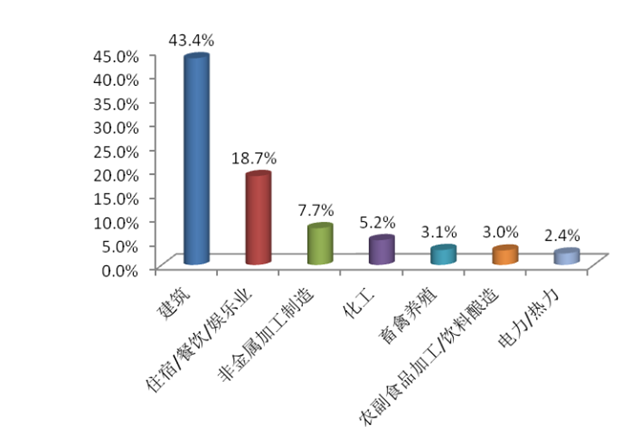 從行業(yè)類型來看,12月公眾反映最集中的行業(yè)是建筑業(yè),占43.4%,其次為住宿餐飲娛樂業(yè)和非金屬加工制造,分別占18.7%和7.7%。其中,建筑業(yè)占比環(huán)比上升5.5個百分點,住宿/餐飲/娛樂業(yè)和畜禽養(yǎng)殖業(yè)舉報占比環(huán)比分別下降3.2和1.3個百分點。