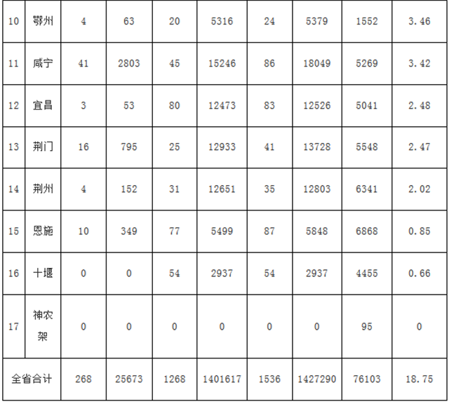 2019年,我省農(nóng)作物秸稈露天禁燒工作堅(jiān)持常抓不懈,注重實(shí)效,深入宣傳引導(dǎo),強(qiáng)化管控措施,加大督查力度,嚴(yán)格壓實(shí)責(zé)任,推進(jìn)綜合利用。通過(guò)全省上下共同努力,露天焚燒秸稈行為得到進(jìn)一步遏制。全省連續(xù)四年未發(fā)生一起因秸稈露天焚燒導(dǎo)致的重污染天氣,秸稈禁燒為環(huán)境空氣質(zhì)量不斷改善發(fā)揮了重要作用。綜合各地平時(shí)秸稈禁燒工作力度和省生態(tài)環(huán)境廳禁燒辦現(xiàn)場(chǎng)檢查、無(wú)人機(jī)巡查等各方面的情況,2019年全省秸稈露天禁燒工作按照好到較差排名為:荊州、荊門、潛江、仙桃、天門、神農(nóng)架、宜昌、咸寧、鄂州、十堰、恩施、襄陽(yáng)、黃岡、孝感、隨州、武漢、黃石。2019年露天焚燒秸稈較嚴(yán)重的市州有:黃石市被省無(wú)人機(jī)巡查3209平方公里,發(fā)現(xiàn)露天焚燒黑斑面積467052平方米;武漢市被省無(wú)人機(jī)巡查5183平方公里,發(fā)現(xiàn)露天焚燒黑斑面積500774平方米,這兩個(gè)市占全省秸稈露天焚燒總面積的67.81%。