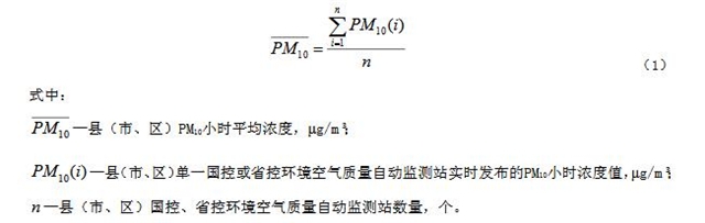 3.4縣(市、區(qū))PM10小時(shí)平均濃度hourlyaverageconcentrationofPM10atthey監(jiān)控點(diǎn)所屬縣(市、區(qū))全部國(guó)控、省控環(huán)境空氣質(zhì)量自動(dòng)監(jiān)測(cè)站實(shí)時(shí)發(fā)布的PM10小時(shí)濃度的算術(shù)平均值。縣(市、區(qū))PM10小時(shí)平均濃度按式(1)計(jì)算: