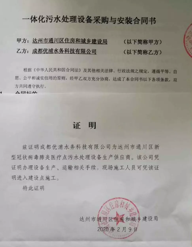 2月9日,因疫情防控需要,達(dá)州市通川區(qū)住房和城鄉(xiāng)建設(shè)局緊急指定優(yōu)普為達(dá)州市通川區(qū)新型冠狀病毒肺炎醫(yī)療點(diǎn)污水處理設(shè)備生產(chǎn)供應(yīng)商,目前已經(jīng)妥當(dāng)組織好設(shè)備生產(chǎn)和安裝、調(diào)試計(jì)劃。