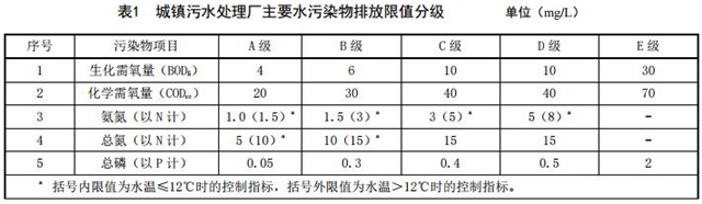 城鎮(zhèn)污水處理廠主要水污染物排放限值分為A、B、C、D、E五個(gè)級(jí)別,每一個(gè)級(jí)別污染物項(xiàng)目的限值詳見表1。