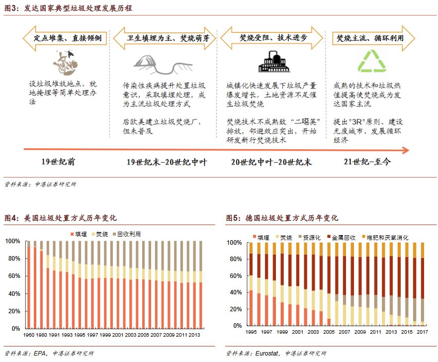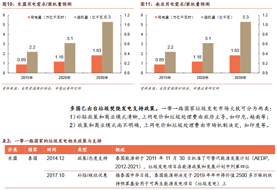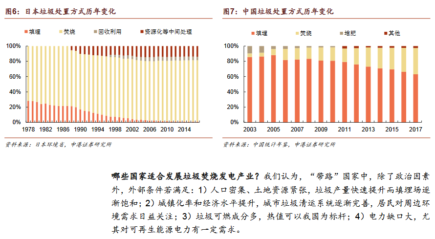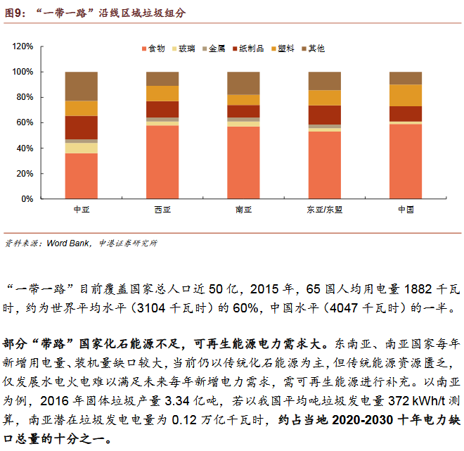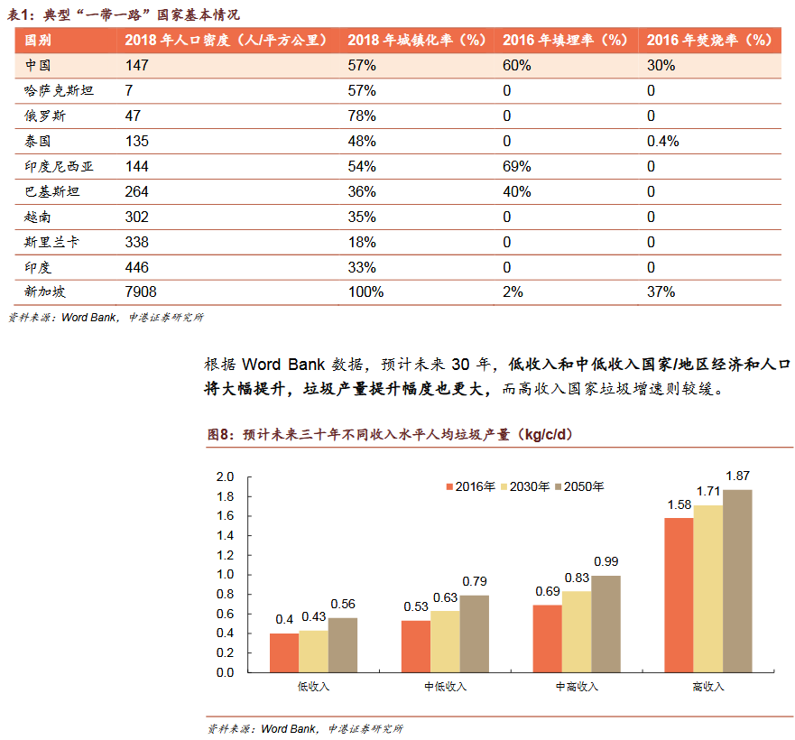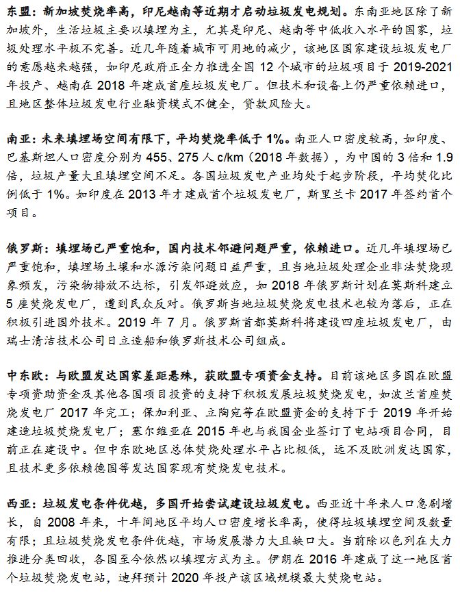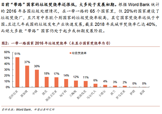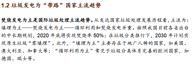 2)垃圾發(fā)電為“帶路”國(guó)家主流發(fā)展趨勢(shì)焚燒發(fā)電為主是國(guó)際垃圾處理主流趨勢(shì)。發(fā)達(dá)國(guó)家垃圾處理的流程為:填埋為主——焚燒發(fā)電為主——循環(huán)利用和焚燒發(fā)電并重。我國(guó)計(jì)劃2020年底實(shí)現(xiàn)焚燒率50%,2030年實(shí)現(xiàn)原生垃圾“零填埋”?!皫贰眹?guó)家符合垃圾焚燒條件。