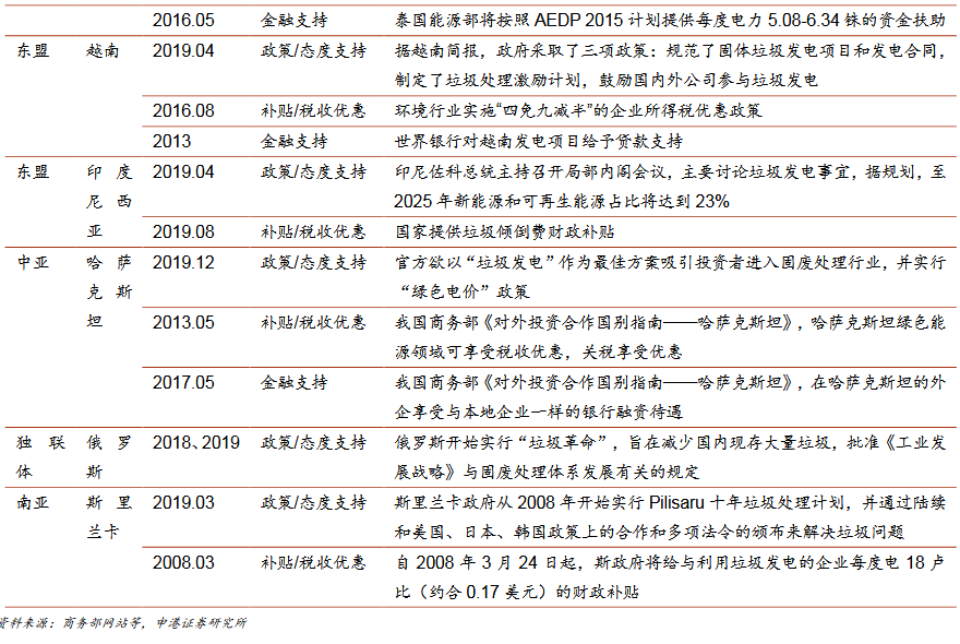 a)人口密集、土地資源緊張,垃圾產(chǎn)量快速提升而填埋場(chǎng)逐漸飽和;b)城鎮(zhèn)化率和經(jīng)濟(jì)水平提升,城市垃圾清運(yùn)系統(tǒng)逐漸完善,居民對(duì)周邊環(huán)境需求日益關(guān)注;c)熱值與我國(guó)接近,能適應(yīng)我國(guó)焚燒爐;d)電力缺口大,部分地區(qū)資源緊張,對(duì)可再生能源電力有一定需求。多國(guó)已出臺(tái)垃圾焚燒發(fā)電支持政策。印尼、越南等國(guó)已出臺(tái)補(bǔ)貼政策,商業(yè)模式清晰,上網(wǎng)電價(jià)和垃圾處理費(fèi)由政府主導(dǎo);部分國(guó)家政策和商業(yè)模式尚不明確,上網(wǎng)電價(jià)和垃圾處理費(fèi)由市場(chǎng)機(jī)制決定,如印度。