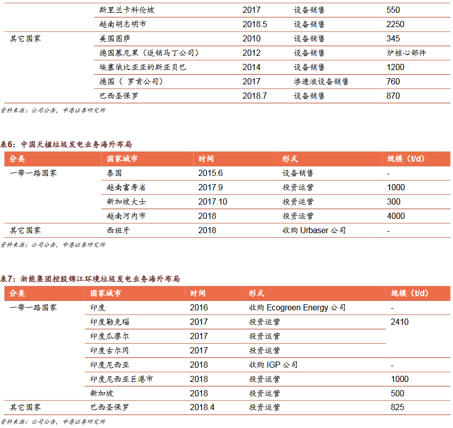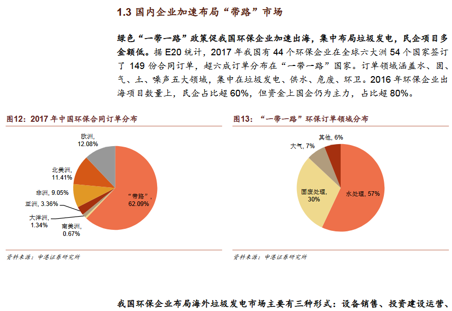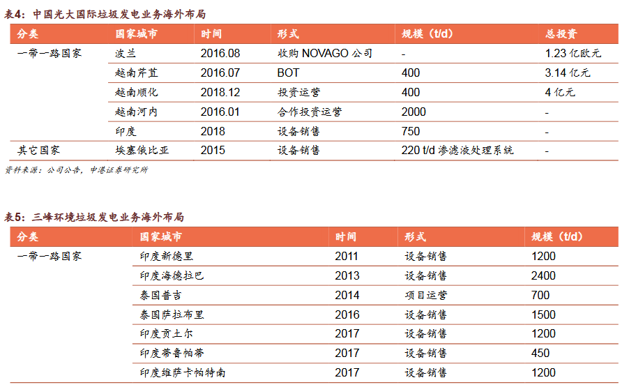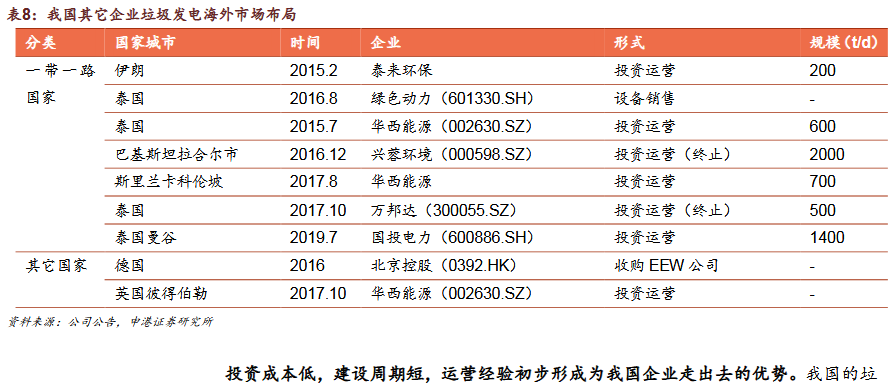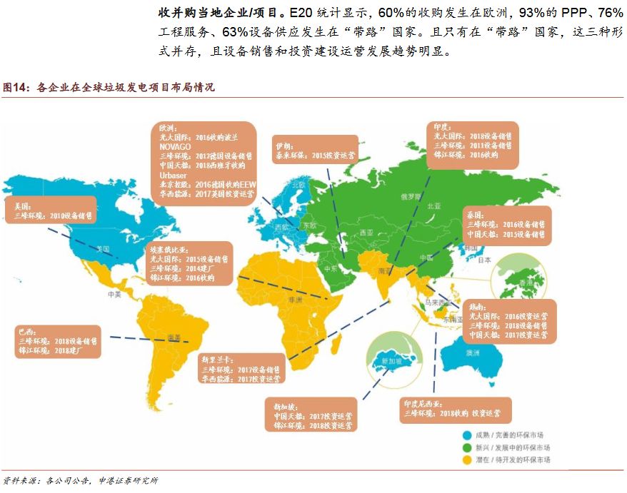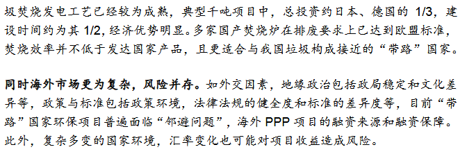 3)國(guó)內(nèi)企業(yè)加速布局“帶路”市場(chǎng)綠色“一帶一路”政策促我國(guó)環(huán)保企業(yè)加速出海,集中布局垃圾發(fā)電,民企項(xiàng)目多金額低。我國(guó)海外垃圾發(fā)電業(yè)務(wù)模式為:設(shè)備銷售、投資建設(shè)運(yùn)營(yíng)、收并購(gòu)當(dāng)?shù)仄髽I(yè)/項(xiàng)目。我國(guó)企業(yè)以投資成本低,建設(shè)周期短,運(yùn)營(yíng)經(jīng)驗(yàn)初步形成為優(yōu)勢(shì),但同時(shí)也面臨了海外市場(chǎng)的復(fù)雜性和風(fēng)險(xiǎn)。