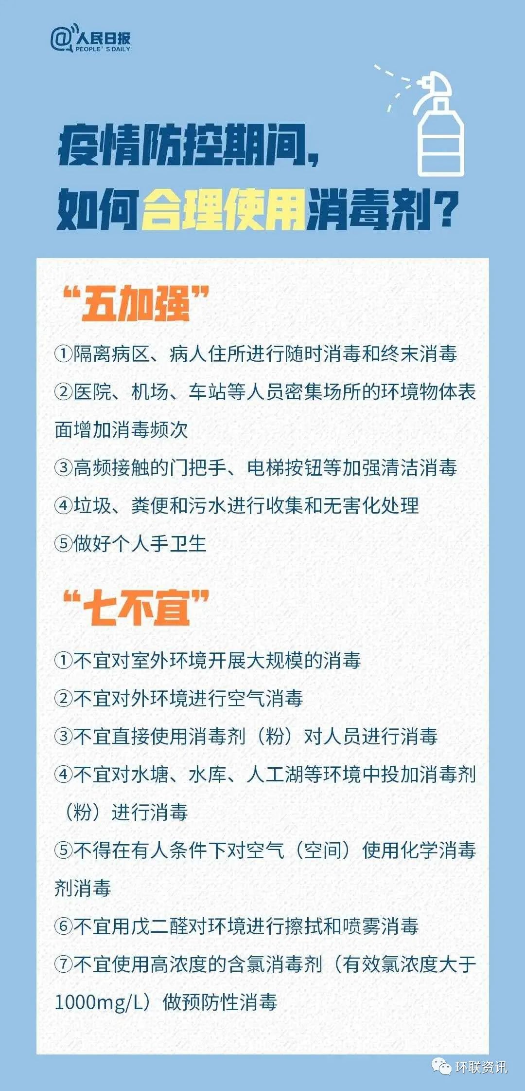 新型冠狀病毒肺炎疫情防控期間,應(yīng)合理使用消毒劑,遵循“五加強(qiáng)七不宜”,真正做到切斷傳播途徑,控制傳染病流行。“五加強(qiáng)”:隔離病區(qū)、病人住所進(jìn)行隨時(shí)消毒和終末消毒;醫(yī)院、機(jī)場(chǎng)、車站等人員密集場(chǎng)所的環(huán)境物體表面增加消毒頻次;高頻接觸的門(mén)把手、電梯按鈕等加強(qiáng)清潔消毒;垃圾、糞便和污水進(jìn)行收集和無(wú)害化處理;做好個(gè)人手衛(wèi)生。“七不宜”:不宜對(duì)室外環(huán)境開(kāi)展大規(guī)模的消毒;不宜對(duì)外環(huán)境進(jìn)行空氣消毒;不宜直接使用消毒劑(粉)對(duì)人員進(jìn)行消毒;不宜對(duì)水塘、水庫(kù)、人工湖等環(huán)境中投加消毒劑(粉)進(jìn)行消毒;不得在有人條件下對(duì)空氣(空間)使用化學(xué)消毒劑消毒;不宜用戊二醛對(duì)環(huán)境進(jìn)行擦拭和噴霧消毒;不宜使用高濃度的含氯消毒劑(有效氯濃度大于1000mg/L)做預(yù)防性消毒。