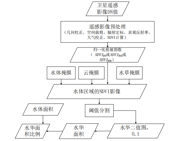 采用衛(wèi)星遙感影像數(shù)據(jù)開展水體的藍(lán)藻水華監(jiān)測(cè),獲得水體中藍(lán)藻水華的空間分布位置,計(jì)算藍(lán)藻水華面積及其所占水體面積比例,據(jù)此評(píng)價(jià)水華程度。