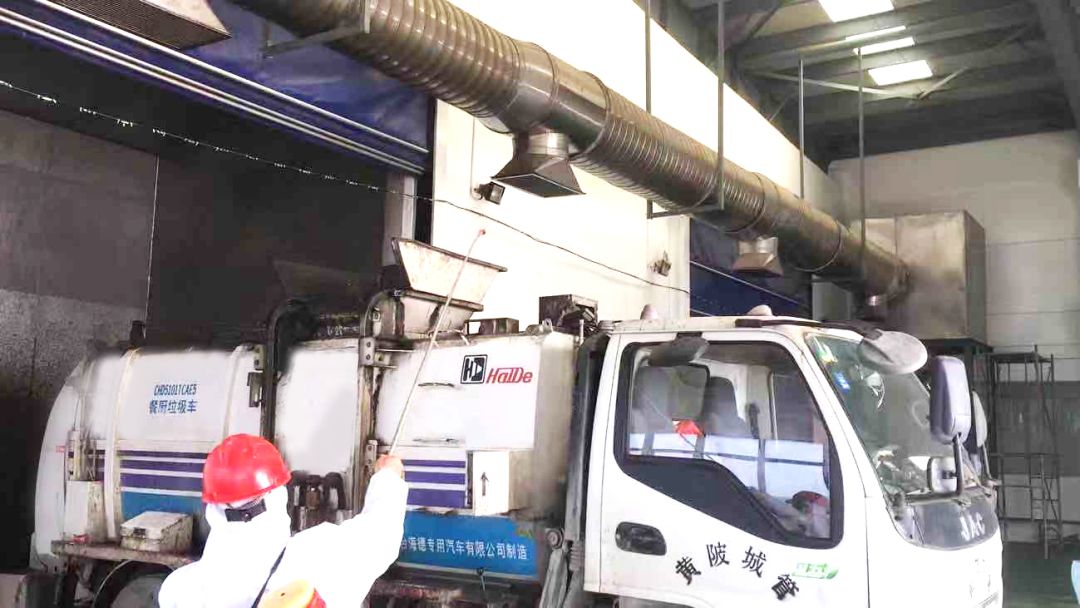 上午9點(diǎn)20分,一輛來自武漢市黃陂區(qū)的餐廚垃圾運(yùn)輸車緩緩駛?cè)肭胺诌x料口,隨著機(jī)器啟動(dòng),滅菌噴淋系統(tǒng)開始運(yùn)轉(zhuǎn)。