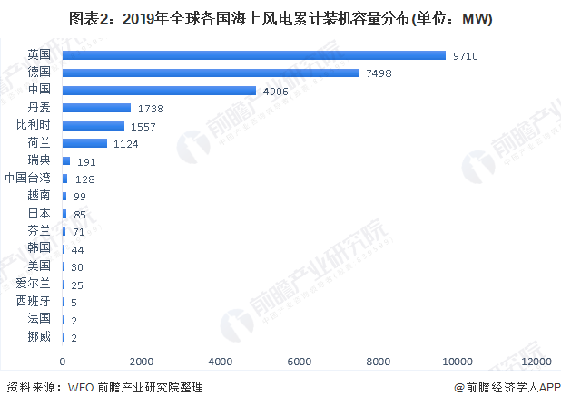 從全球各國(guó)已投運(yùn)海上風(fēng)電場(chǎng)的裝機(jī)容量對(duì)比來(lái)看,英國(guó)仍然占據(jù)領(lǐng)先地位。2019年,英國(guó)海上風(fēng)電累計(jì)裝機(jī)容量達(dá)到9.7MW;其次是德國(guó),海上風(fēng)電累計(jì)裝機(jī)量7.5GW;中國(guó)是全球海上風(fēng)電第三大市場(chǎng),累計(jì)裝機(jī)容量4.9GW。