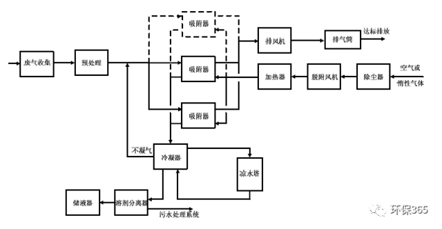 當(dāng)廢氣中的有機(jī)物具有回收價(jià)值時(shí),可根據(jù)情況選擇采用水蒸氣再生、熱氣流(空氣或惰性氣體)再生或降壓解吸再生工藝。脫附后產(chǎn)生的高濃度氣體可根據(jù)情況選擇采用降溫冷凝或液體吸收工藝對(duì)有機(jī)物進(jìn)行回收。