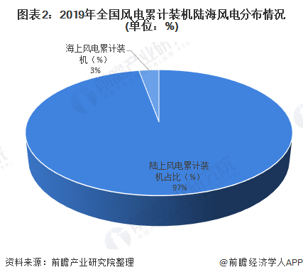 從風電結構看,截至2019年底,全國風電累計裝機2.1億千瓦中,陸上風電累計裝機占主要比重,達到2.04億千瓦,占比97%;海上風電累計裝機593萬千瓦,占比3%。