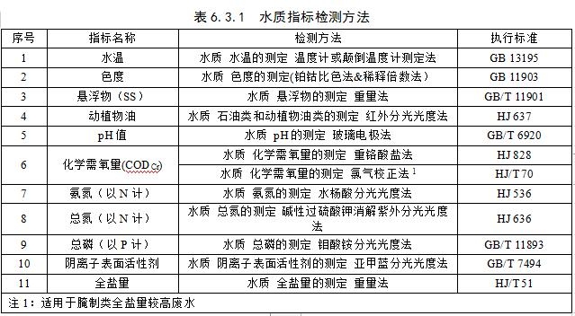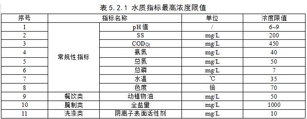 可以排入的污水則應(yīng)兼具日累計(jì)污水量不得超過集中處理設(shè)施的設(shè)計(jì)規(guī)模、應(yīng)均勻排入集中處理設(shè)施,避免溢流及沖擊影響集中處理設(shè)施正常運(yùn)行。排水戶污水水質(zhì)常規(guī)性指標(biāo)包括pH值、SS、CODCr、氨氮、總氮、總磷、水溫、色度等8項(xiàng),其中餐飲類廢水應(yīng)增加動植物油指標(biāo)的檢測,食品腌制類污水應(yīng)增加全鹽量指標(biāo)的檢測,洗滌類污水應(yīng)增加陰離子表面活性劑的檢測;水質(zhì)指標(biāo)最高濃度限值應(yīng)符合下表要求。
