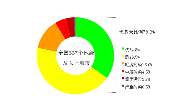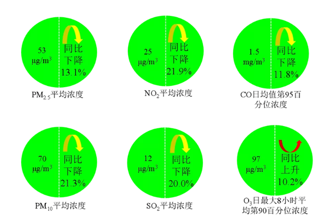 1-2月,全國(guó)337個(gè)地級(jí)及以上城市平均優(yōu)良天數(shù)比例為78.3%,同比上升7.4個(gè)百分點(diǎn);111個(gè)城市環(huán)境空氣質(zhì)量達(dá)標(biāo),同比增加28個(gè);PM2.5濃度為53微克/立方米,同比下降13.1%;PM10濃度為70微克/立方米,同比下降21.3%;O3濃度為97微克/立方米,同比上升10.2%;SO2濃度為12微克/立方米,同比下降20.0%;NO2濃度為25微克/立方米,同比下降21.9%;CO濃度為1.5毫克/立方米,同比下降11.8%。