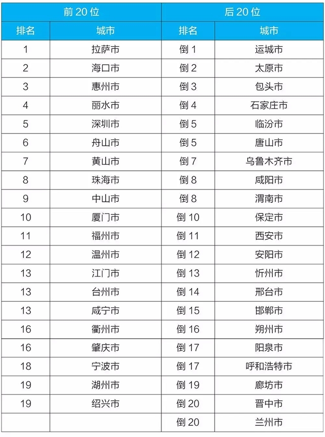 2月,168個(gè)重點(diǎn)城市中運(yùn)城、太原、包頭市等城市空氣質(zhì)量相對(duì)較差(從倒數(shù)第1名至并列倒數(shù)第20名);拉薩、海口、惠州市等城市空氣質(zhì)量相對(duì)較好(從第1名至并列第19名,見附表5)。