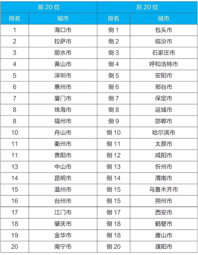 1-2月,168個(gè)重點(diǎn)城市中包頭、臨汾、石家莊市等城市空氣質(zhì)量相對(duì)較差(從倒數(shù)第1名至倒數(shù)第20名);??凇⒗_、麗水市等城市空氣質(zhì)量相對(duì)較好(從第1名至第20名,見附表6)。