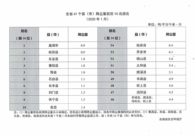 《全省61個(gè)縣(市)降塵量前后10名排名(2020年1月)》顯示:巢湖市、樅陽縣降塵量最小且相同,為0.9噸/平方千米·月。東至縣、青陽縣、黟縣降塵量相同(1.0噸/平方千米·月),并列第三位;臨泉縣降塵量最大(6.4噸/平方千米·月),其次是界首市和碭山縣。繁昌縣、和縣、南陵縣、無為縣、蕪湖縣、臨泉縣和太和縣7個(gè)縣1月未按時(shí)開展降塵監(jiān)測(cè)工作。