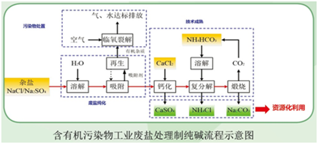 利用吸附-脫附技術(shù)富集工業(yè)廢鹽溶液中的有機(jī)污染物,再通過(guò)臨氧裂解技術(shù)實(shí)現(xiàn)達(dá)標(biāo)排放,凈化后的鹽溶液進(jìn)入制堿工藝,制堿工藝技術(shù)成熟,從而實(shí)現(xiàn)工業(yè)廢鹽的資源化利用。