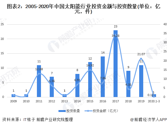 從太陽能行業(yè)的投資規(guī)模來看,2009-2019年新能源行業(yè)投資金額呈現(xiàn)波動(dòng)變化,2017年達(dá)到峰值34.28億元,2019年全年太陽能行業(yè)的投資金額為21.07億元,同比增長(zhǎng)384.37%,2020年1-3月中旬太陽能行業(yè)的投資金額達(dá)到0.12億元。