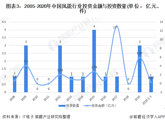 從風(fēng)能行業(yè)的投資事件數(shù)量來看,2005-2019年整體呈現(xiàn)波動(dòng)變化,2019年風(fēng)能行業(yè)的融資事件有3件,2020年1-3月中旬新能源行業(yè)融資事件數(shù)量有1件。