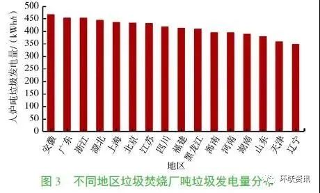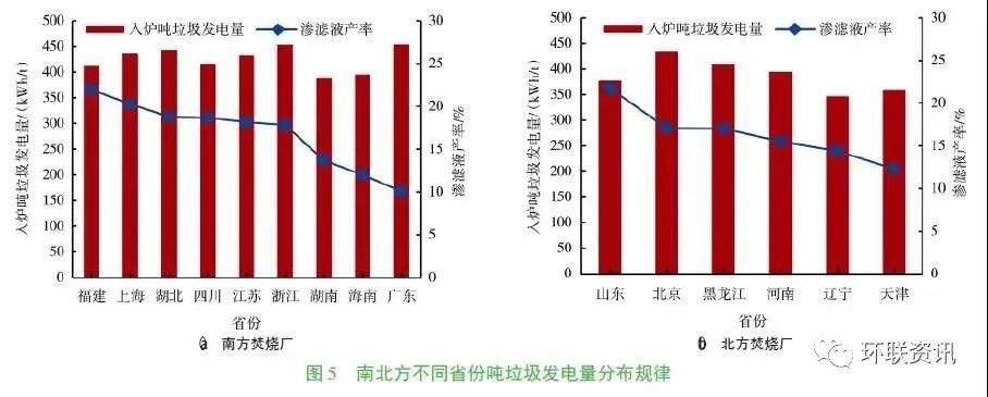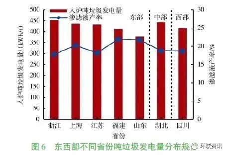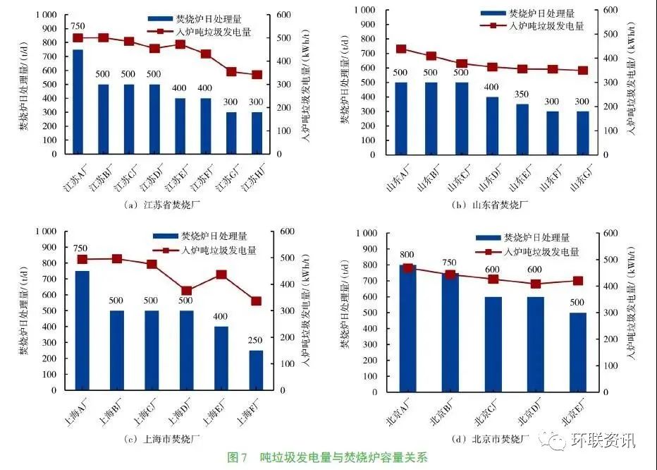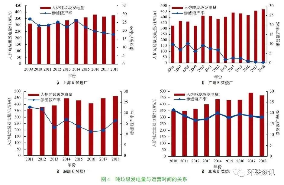 隨著我國經(jīng)濟(jì)的快速發(fā)展,城市生活垃圾產(chǎn)生量迅速增加。垃圾焚燒處理具有減量化和無害化程度高的優(yōu)點(diǎn),已成為我國城市生活垃圾處理的主要方式。截至2018年12月底,已運(yùn)營的生活垃圾焚燒發(fā)電廠364座。隨著生活垃圾焚燒廠數(shù)量的快速增加,其年發(fā)電總量也迅速增加,如圖1所示,2017年生活垃圾焚燒廠發(fā)電總量已達(dá)37.6TWh。生活垃圾焚燒廠在無害化處理垃圾的同時(shí),通過余熱發(fā)電回收能源,降低了焚燒廠運(yùn)行費(fèi)用。因此對于現(xiàn)有垃圾焚燒廠發(fā)電量的變化規(guī)律及影響因素進(jìn)行深入分析,有助于提高生活垃圾焚燒廠發(fā)電效率,實(shí)現(xiàn)垃圾焚燒爐的安全經(jīng)濟(jì)運(yùn)行。數(shù)量眾多的垃圾焚燒發(fā)電廠分布在全國各地,不同地區(qū)的垃圾組分和熱值以及不同焚燒廠的工藝參數(shù)均有明顯差異,這對垃圾焚燒廠發(fā)電量有重要影響。國內(nèi)外部分研究人員已對生活垃圾理化特性及焚燒爐發(fā)電量、工藝參數(shù)等方面進(jìn)行了探究分析。對夏季的北京城區(qū)不同主體產(chǎn)生的垃圾成分和理化特性的研究表明,垃圾的含水量直接影響到燃料發(fā)熱量;而垃圾含水率與廚余的相關(guān)性最大,降水量對垃圾含水率影響不大。北京、上海、深圳等地垃圾組分的歷史數(shù)據(jù)表明,垃圾中廚余含量呈下降趨勢,紙類和塑料含量則呈上升趨勢,垃圾熱值呈上升趨勢;近幾年隨著人們生活水平和生活習(xí)慣逐漸穩(wěn)定,垃圾,經(jīng)濟(jì)發(fā)展水平較低的地區(qū)垃圾中有機(jī)物占比較高,而經(jīng)濟(jì)發(fā)達(dá)地區(qū)紙類成分更多。文獻(xiàn)數(shù)據(jù) 表明垃圾成分的改變會影響其發(fā)熱量的變化,并將進(jìn)一步影響焚燒爐噸垃圾發(fā)電量。現(xiàn)有研究成果較多關(guān)注提高鍋爐蒸汽參數(shù)來提高垃圾焚燒廠發(fā)電效率,或通過工藝改進(jìn)來提高發(fā)電效率,如組合式高效垃圾發(fā)電工藝(WTE-GT)和再熱循環(huán)工藝。然而研究人員對垃圾組分變化后噸垃圾發(fā)電量的變化趨勢未做過多關(guān)注,同時(shí)隨著我國焚燒廠垃圾處理量的不斷增大,焚燒爐單爐垃圾處理量日益增大,其對焚燒爐噸垃圾發(fā)電量的影響被關(guān)注較少。本文以部分有代表性的爐排爐焚燒發(fā)電廠為研究對象,對比分析了地理位置、運(yùn)營年限及焚燒爐容量等因素對焚燒爐噸垃圾發(fā)電量變化的影響,并對垃圾焚燒爐的清潔高效運(yùn)行提出了建議。本文選取已投產(chǎn)的92座爐排爐垃圾焚燒廠為研究對象,約占總投產(chǎn)焚燒爐數(shù)量的25%。如圖2所示,研究樣本主要分布在經(jīng)濟(jì)發(fā)達(dá)地區(qū),如四川、江蘇、山東、廣東、上海、天津、北京、浙江等,同時(shí)在地理分布上實(shí)現(xiàn)了東、南、西、北全覆蓋。焚燒廠投產(chǎn)年份從2003年到2018年,垃圾處理量范圍為450~3000t/d,單臺焚燒爐垃圾處理量范圍為150~750t/d。焚燒爐蒸汽參數(shù)范圍為400~450℃、4.0~6.3MPa。由于進(jìn)入焚燒廠的生活垃圾會在垃圾倉發(fā)酵后再投入焚燒爐,因此筆者重點(diǎn)分析了入爐噸垃圾發(fā)電量的變化規(guī)律。同時(shí)為避免季節(jié)變化對垃圾成分和熱值的影響,采用城市生活垃圾焚燒廠年平均運(yùn)營數(shù)據(jù)進(jìn)行分析,包括年進(jìn)廠垃圾量、年進(jìn)爐垃圾量、年平均滲濾液產(chǎn)率、年發(fā)電量、入爐噸垃圾發(fā)電量等數(shù)據(jù)。其中年平均滲濾液產(chǎn)率L通過年進(jìn)廠垃圾量M和年進(jìn)爐垃圾量m計(jì)算獲得,如式(1)所示。入爐噸垃圾發(fā)電量e通過年發(fā)電量E 和年進(jìn)爐垃圾量m計(jì)算獲得,如式(2) 所示。垃圾焚燒產(chǎn)生的蒸汽主要用于發(fā)電和供熱,提高噸垃圾發(fā)電量對于提高垃圾焚燒廠經(jīng)濟(jì)效益和垃圾資源化利用具有重要意義。圖3為不同地區(qū)垃圾焚燒廠入爐噸垃圾發(fā)電量年平均數(shù)據(jù),由圖可知不同地區(qū)入爐噸垃圾發(fā)電量分布范圍為366~467kWh/t,地區(qū)之間的差異明顯,最大值和最小值相差約100kWh/t。其中,東南沿海地區(qū)噸垃圾發(fā)電量較高,如廣東、浙江、上海、江蘇;而東北地區(qū)垃圾發(fā)電量均較低,遼寧噸垃圾發(fā)電量最低為366kWh/t;這是因?yàn)闁|南沿海地區(qū)經(jīng)濟(jì)更為發(fā)達(dá),垃圾熱值更高,噸垃圾發(fā)電量升高。對比發(fā)現(xiàn),北方地區(qū)噸垃圾發(fā)電量低于南方地區(qū),東西部經(jīng)濟(jì)發(fā)達(dá)地區(qū)噸垃圾發(fā)電量無明顯差異。3.1 噸垃圾發(fā)電量與運(yùn)營時(shí)間的關(guān)系如圖4所示,上海、廣州、深圳、北京等地不同焚燒廠噸垃圾發(fā)電量隨著運(yùn)營時(shí)間增加均呈上升趨勢,而垃圾滲濾液產(chǎn)率則逐年下降。隨著經(jīng)濟(jì)發(fā)展,居民生活水平逐年提高,生活垃圾中廚余含量呈下降趨勢,紙類和塑料含量呈上升趨勢,而廚余含水率高,因而垃圾中滲濾液產(chǎn)率呈下降趨勢。隨著垃圾滲濾液產(chǎn)率近年來逐漸下降,噸垃圾熱值升高,垃圾焚燒廠處理相同質(zhì)量垃圾獲得熱量更多,生產(chǎn)更多電能,因而噸垃圾發(fā)電量升高。圖4中4座垃圾焚燒廠噸垃圾發(fā)電量上升趨勢均與滲濾液產(chǎn)率下降趨勢呈現(xiàn)很好的相關(guān)性,