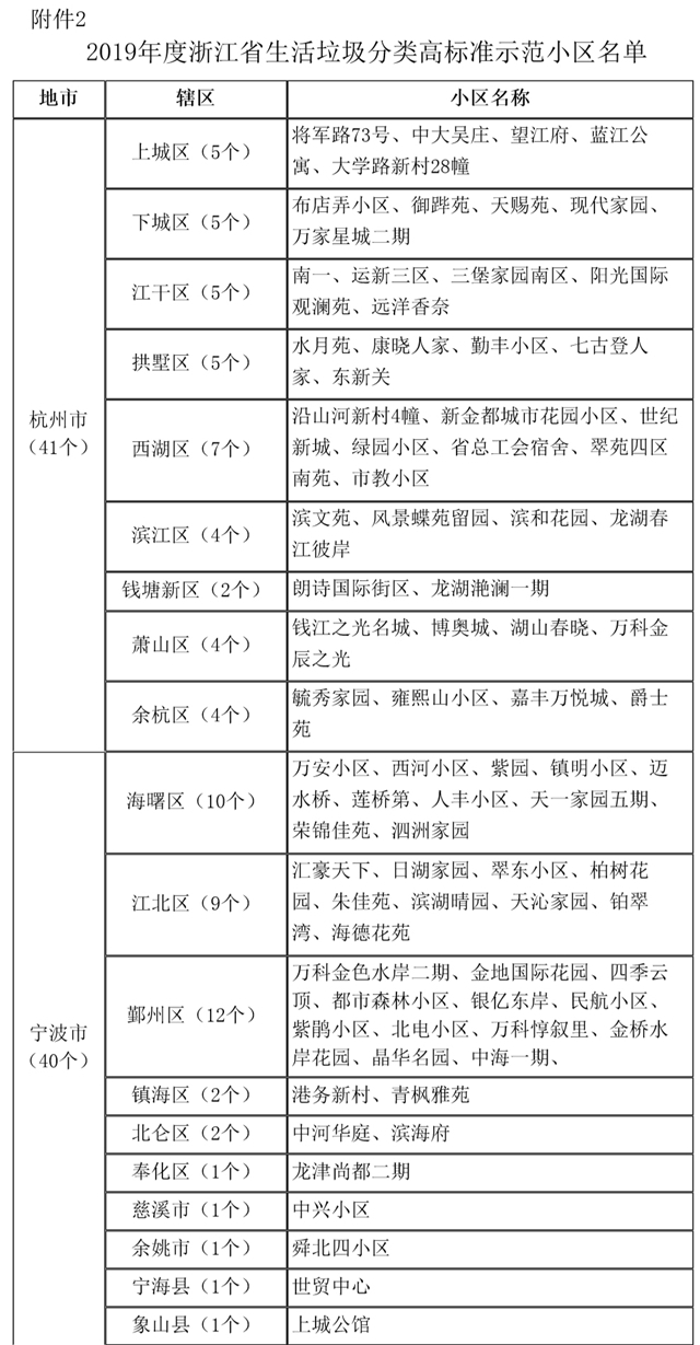 根據(jù)《關(guān)于印發(fā)〈浙江省城鎮(zhèn)生活垃圾分類實(shí)施方案〉的通知》(浙委辦發(fā)〔2017〕85號)、《關(guān)于印發(fā)〈浙江省生活垃圾分類“五大”專項(xiàng)行動計(jì)劃〉的通知》(浙分類〔2018〕4號)、《關(guān)于高水平推進(jìn)生活垃圾治理工作的意見》(浙委辦〔2019〕59號)等要求,各地對照《浙江省高標(biāo)準(zhǔn)生活垃圾分類示范小區(qū)評價(jià)標(biāo)準(zhǔn)(試行)》(建城發(fā)〔2017〕373號),組織開展了省級生活垃圾分類示范片區(qū)、高標(biāo)準(zhǔn)示范小區(qū)創(chuàng)建工作。經(jīng)各市驗(yàn)收、省分類辦審核,現(xiàn)將2019年度全省生活垃圾分類示范片區(qū)、高標(biāo)準(zhǔn)示范小區(qū)名單予以公布。