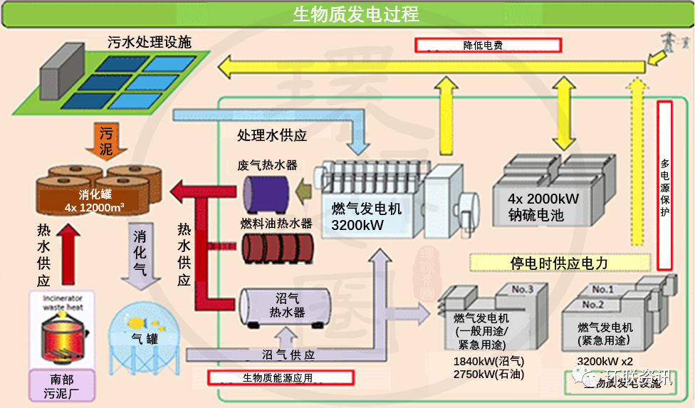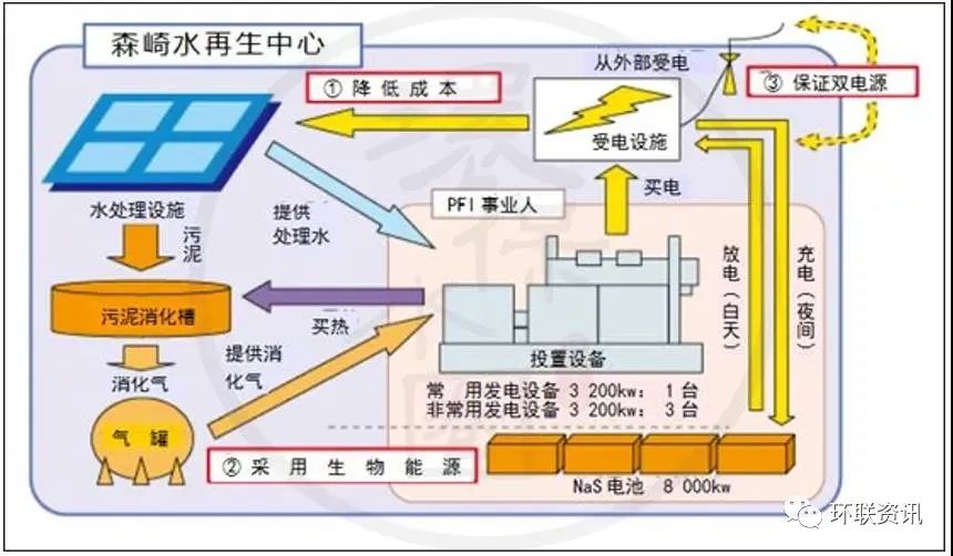 森崎水回收中心東部還設(shè)有有四個(gè)消化罐,用來從有機(jī)污泥成分中產(chǎn)生甲烷氣體,這將減少最終的污泥體積。每個(gè)消化罐內(nèi)徑28米,深度19.5米(容積12000立方米),消化溫度約為50攝氏度。為了構(gòu)建可持續(xù)發(fā)展和循環(huán)型社會(huì),為下一代營造宜人的全球環(huán)境,森崎水回收中心正在努力利用污水處理過程中產(chǎn)生的能量,污泥和再生水來獲得資源和能源。夏季的廢水溫度低于夏季,冬季的溫度高于大氣溫度,“城市供熱”系統(tǒng)正是利用廢水溫差來實(shí)現(xiàn)區(qū)域供熱和制冷的。“城市供熱”系統(tǒng)的采用減少了化石燃料(石油,天然氣等)的使用,并有助于減少空氣污染物和電力消耗。項(xiàng)目開始時(shí)間:2006年10月將從水再生中心獲得的處理后的廢水供應(yīng)到新的索尼公司大樓,以冷卻大樓的空調(diào)設(shè)備??照{(diào)產(chǎn)生的廢熱,通過熱交換器處理后被廢水吸收。該項(xiàng)目的環(huán)境影響是,由于冷卻設(shè)備運(yùn)行所需的電力和自來水的減少,CO2排放量每年減少約22 t。此外,與將所有熱量釋放到大氣中的常規(guī)方法相比,該項(xiàng)目中的熱量釋放到處理后的廢水中,有助于應(yīng)對熱島現(xiàn)象。 生物質(zhì)發(fā)電(與私營企業(yè)合作)廢水處理方法中產(chǎn)生的污泥在消化池中加熱,然后污泥中的有機(jī)物變成甲烷氣,減少了污泥量。過程中產(chǎn)生的甲烷是生物質(zhì)(可再生)能源,可以被用作發(fā)電設(shè)備的燃料,每年可發(fā)電22.8 kWh。在發(fā)電設(shè)施的安裝和管理方面,森崎率先引進(jìn)了PFI(私人融資計(jì)劃:是一種公私合作的方法,將資金、技術(shù)知識(shí)和管理技能從私營部門帶到公共機(jī)構(gòu)),它可以降低設(shè)施建設(shè)或維護(hù)/管理的成本。它也通過可交易的綠色證書作為環(huán)境價(jià)值能源轉(zhuǎn)讓給第三方。該中心還安裝了世界上最大的NaS電池設(shè)備,用于全天的分布式電力負(fù)載:在夜間有效地使用低成本的電力,并在用電高峰期減少使用電池供電。