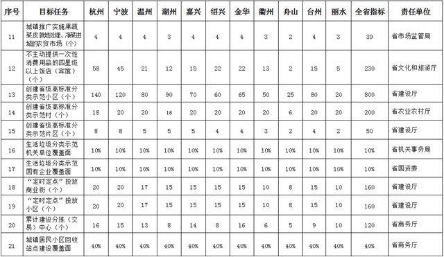 9.建立健全垃圾分類制度。建立以“易腐垃圾、可回收物、有害垃圾、其他垃圾”為基本分類標(biāo)準(zhǔn)的分類制度。按照“管行業(yè)、管分類,誰主管、誰負(fù)責(zé)”的原則,各級各部門負(fù)責(zé)督促指導(dǎo)本單位本系統(tǒng)本行業(yè)全面實施生活垃圾強制分類。全省新增10%以上的黨政機關(guān)、國有企事業(yè)單位建設(shè)生活垃圾分類示范單位。全省城鎮(zhèn)生活垃圾分類收集覆蓋面達(dá)到90%以上,農(nóng)村生活垃圾分類覆蓋面達(dá)到85%以上。(責(zé)任單位:省分類辦、省建設(shè)廳、省農(nóng)業(yè)農(nóng)村廳等相關(guān)省級部門)