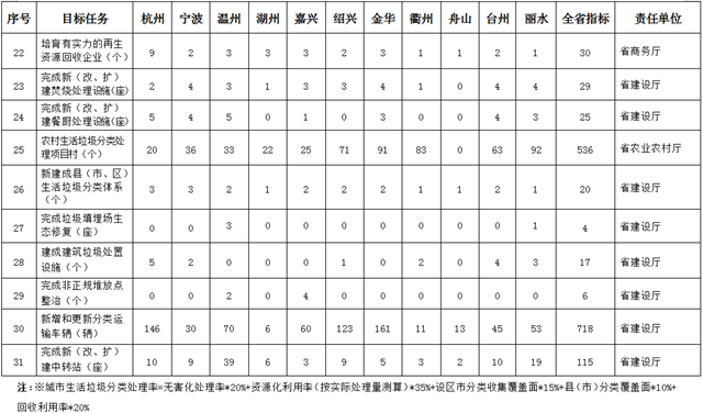 到2020年底,通過強化源頭減量和垃圾處理設(shè)施建設(shè),全省城鄉(xiāng)生活垃圾總量基本實現(xiàn)“零增長”和生活垃圾“零填埋”;全省城鎮(zhèn)、農(nóng)村生活垃圾分類覆蓋面分別達(dá)到90%、85%以上;全省城鄉(xiāng)生活垃圾回收利用率達(dá)到45%以上,資源化利用率達(dá)到90%以上,無害化處理率達(dá)到100%,力爭新增城鎮(zhèn)生活垃圾處理能力2萬噸/日以上,率先實現(xiàn)焚燒和餐廚垃圾處理設(shè)施縣縣全覆蓋;新增省級高標(biāo)準(zhǔn)生活垃圾分類示范小區(qū)500個以上;建立匹配完善的生活垃圾分類投放、分類收集、分類運輸、分類處理體系,制度框架和政策體系基本形成,基層組織作用充分發(fā)揮,社會氛圍日益濃厚,共建共治共享治理體系初步形成。