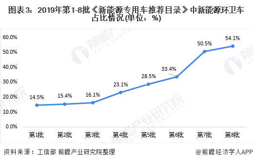 根據(jù)2019年工信部發(fā)布的1-8批《新能源專用車推薦目錄》,新能源環(huán)衛(wèi)車占比逐步提高,由第1批的14.5%提高至第8批的54.1%。新能源環(huán)衛(wèi)車的推廣使用將直接帶動其銷量的增長。