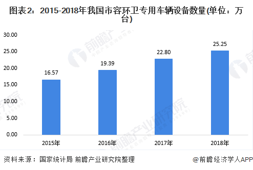 環(huán)衛(wèi)車是用于城市市容整理、清潔的專用車輛,是我國環(huán)衛(wèi)行業(yè)的重要運營設(shè)備。環(huán)衛(wèi)車按用途可分為:灑水車、掃路車、洗掃車、吸塵車、垃圾車和除雪車。數(shù)據(jù)顯示,2018年,我國市容環(huán)衛(wèi)專用車輛設(shè)備約25.25萬臺,同比增長2.45萬臺。
