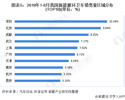 按銷售區(qū)域來看,2019年1-8月,我國新能源環(huán)衛(wèi)車銷量排名前十的城市中,銷量份額占比最大的是深圳市,為10.34%;其次是北京市,占比9.64%。