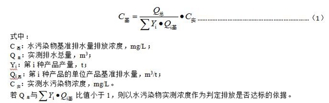 若企業(yè)同時生產兩種以上產品可適用不同排放控制要求或不同行業(yè)國家污染物排放標準,且生產設施產生的污水混合處理排放的情況下,應執(zhí)行排放標準中規(guī)定的最嚴格的濃度限值,并按公式(1)換算水污染物基準水量排放濃度。
