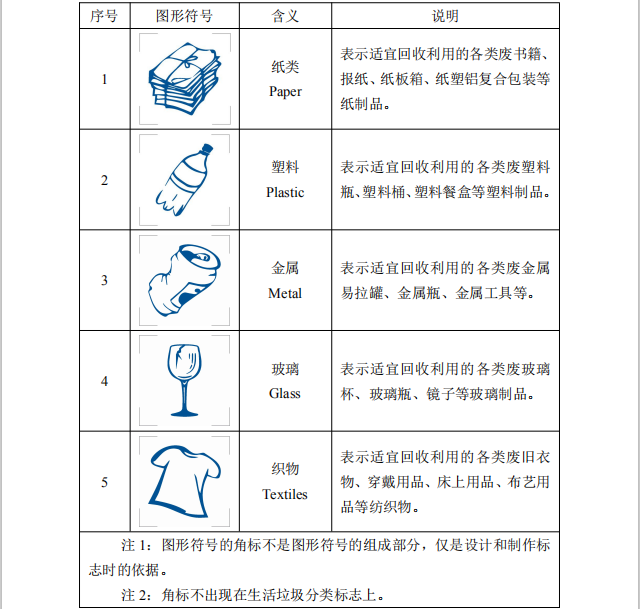 1 可回收物:表示適宜回收利用的生活垃圾,包括紙類、塑料、金屬、玻璃、織物等。