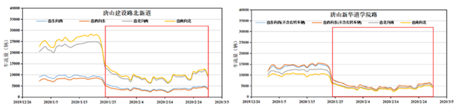 根據(jù)唐山市城區(qū)5條主干道車流量統(tǒng)計數(shù)據(jù)顯示,疫情期間車流量均明顯減小,日均車流量與非疫情期間比例在0.32~0.42之間,機動車排放明顯下降,由此可解釋疫情防控期間城市NO2的明顯降低。