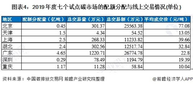 2019 年七個試點碳市場共分配配額11.66 億噸;完成線上配額交易量2 187 萬噸,達成交易額7.73 億元;成交均價為35.39 元/噸。配額分配總量和配額線上成交總量較2018 年有所減少,但成交總額和成交均價有所提升。