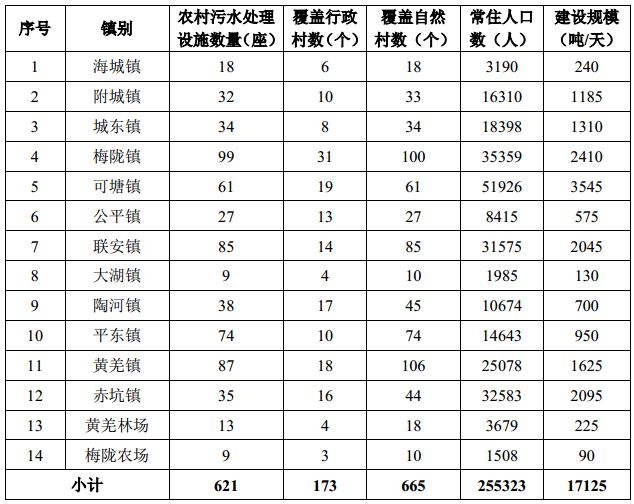 2)農(nóng)村部分:海城鎮(zhèn)、附城鎮(zhèn)、城東鎮(zhèn)、梅隴鎮(zhèn)、可塘鎮(zhèn)、公平鎮(zhèn)、聯(lián)安鎮(zhèn)、大湖鎮(zhèn)、陶河鎮(zhèn)、平東鎮(zhèn)、黃羌鎮(zhèn)、赤坑鎮(zhèn)、黃羌林場(chǎng)、梅隴農(nóng)場(chǎng)農(nóng)村部分合計(jì)新建621座農(nóng)村污水處理設(shè)施,擬建設(shè)總規(guī)模17125噸/天,服務(wù)農(nóng)村總常住人口約25.53萬(wàn)人。