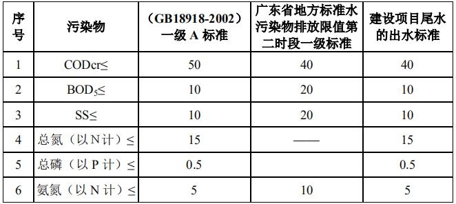 1)新建、擴(kuò)建城鎮(zhèn)污水處理設(shè)施的出水水質(zhì)符合《城鎮(zhèn)污水處理廠污染物排放標(biāo)準(zhǔn)》(GB18918-2002)一級(jí)A標(biāo)準(zhǔn)和廣東省地方標(biāo)準(zhǔn)《水污染物排放限值》(DB44/26-2001)第二時(shí)段一級(jí)標(biāo)準(zhǔn)中的較嚴(yán)值;