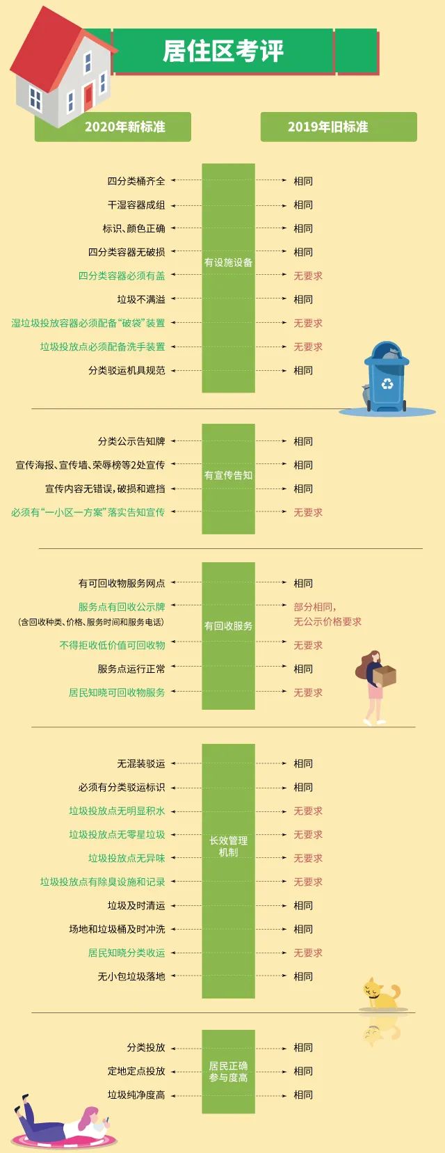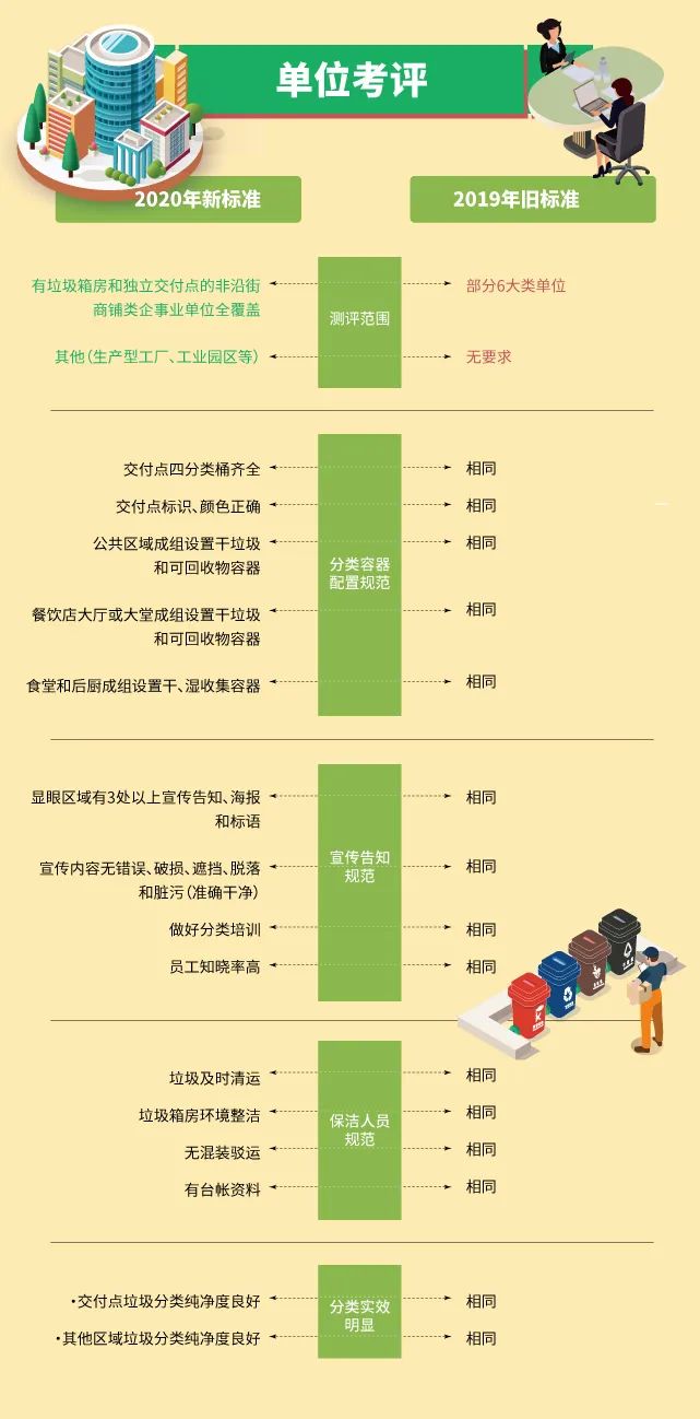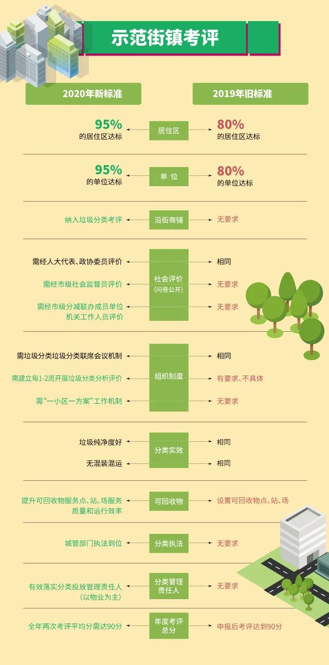 同時(shí),考核細(xì)則上也有進(jìn)一步提升,一是居住區(qū)和單位對照驗(yàn)收標(biāo)準(zhǔn),將示范標(biāo)準(zhǔn)由2019年的80分提升到90分以上(含)。二是街鎮(zhèn)內(nèi)示范居住區(qū)和單位的比例也由2019年的80%提升到95%以上(含)。