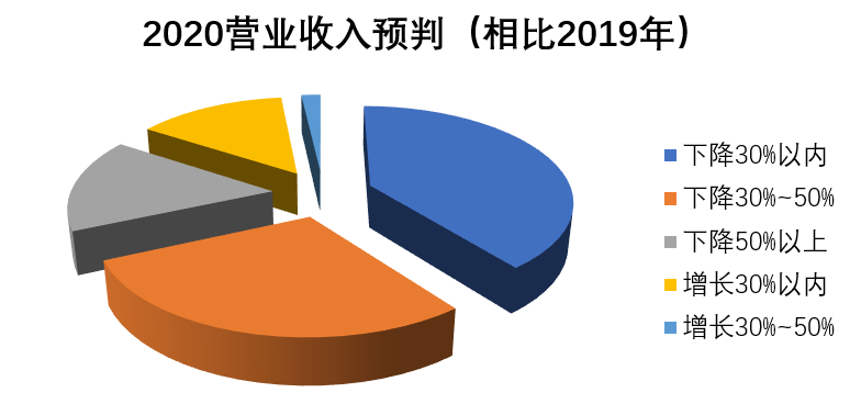 從調(diào)查結(jié)果得知,多數(shù)企業(yè)認(rèn)為今年的營收情況將受到一定程度的沖擊。有39.5%的企業(yè)認(rèn)為相比2019年,企業(yè)2020年的營業(yè)收入將下降30%以內(nèi);認(rèn)為將下降30%——50%的企業(yè)占比28.9%;另有15.8%的企業(yè)認(rèn)為收入將下降超過50%??上驳氖牵谀壳皣?yán)峻的形勢下,仍有部分企業(yè)對未來的營收情況持樂觀態(tài)度:有14%的企業(yè)認(rèn)為2020年的收入將比2019年增長30%以內(nèi);更有1.8%的企業(yè)認(rèn)為將增長30%~50%。