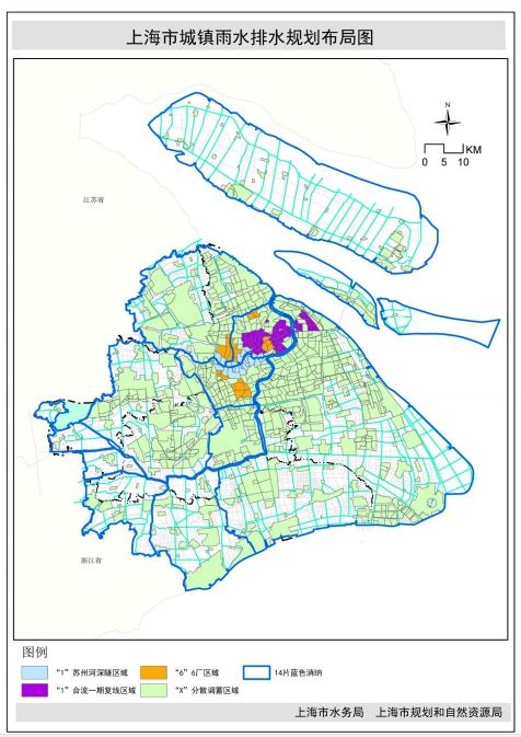 本市城鎮(zhèn)雨水排水規(guī)劃形成“1+1+6+X綠灰交融,14片藍(lán)色消納”的總體布局。即:規(guī)劃“1”蘇州河深隧區(qū)、“1”合流一期復(fù)線區(qū)、“6”六座污水廠周邊區(qū)域、“X”分散調(diào)蓄區(qū)等綠灰交融的四大服務(wù)區(qū)域;同時(shí)按照14個(gè)水利片的總體布局,推進(jìn)河湖水系及除澇泵閘建設(shè),形成消納能力與城鎮(zhèn)雨水排水相匹配的防洪除澇體系。