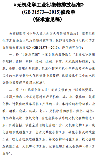 無機化學(xué)工業(yè)污染物排放標準修改單(征求意見稿)