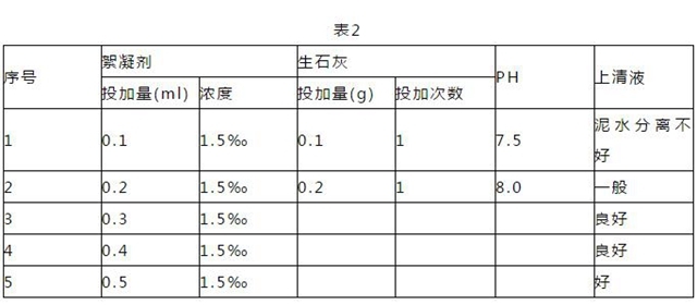 3月18日上午在專業(yè)人員的指導(dǎo)下,我們決定對2#氧化溝系列采用投生石灰和絮凝劑來控制氧化溝內(nèi)因污泥膨脹產(chǎn)生的褐色泡沫,投生石灰是為了殺死活性污泥中的絲狀菌(利用絲狀菌不能在堿性環(huán)境中生存的原理),投絮凝劑是為了增加活性污泥的沉降性能。首先做小試,確定生石灰和絮凝劑投加量,取2#氧化溝內(nèi)混合液1000ml,首加0.1g生石灰,測PH值為7.7,再加0.1g生石灰攪拌,測PH為8.03,小試后確定每升混合液中加0.2g生石灰,換算為每方0.2kg;然后向混合液中加1.5‰的絮凝劑從0.1ml開始加至0.5ml時(shí),混合液的泥水分離較好,上清液變清亮,換算為每方混合液加1.5‰的絮凝劑0.5 kg。