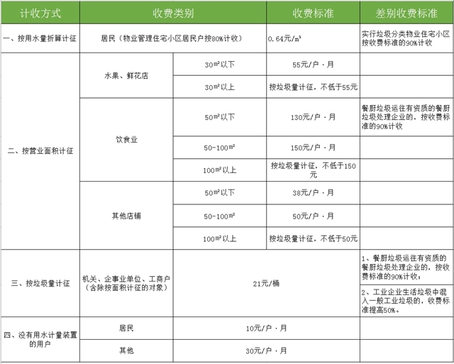 經(jīng)營單位生活垃圾處理費(fèi)征收標(biāo)準(zhǔn):