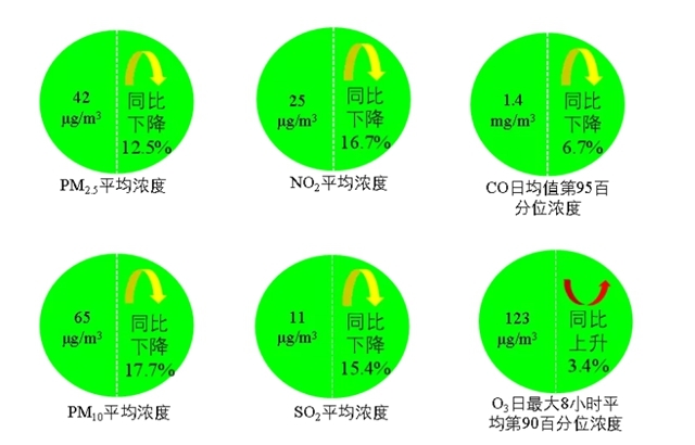 1-4月,全國(guó)337個(gè)地級(jí)及以上城市平均優(yōu)良天數(shù)比例為84.8%,同比上升5.0個(gè)百分點(diǎn);129個(gè)城市環(huán)境空氣質(zhì)量達(dá)標(biāo),同比增加26個(gè);PM2.5濃度為42微克/立方米,同比下降12.5%;PM10濃度為65微克/立方米,同比下降17.7%;O3濃度為123微克/立方米,同比上升3.4%;SO2濃度為11微克/立方米,同比下降15.4%;NO2濃度為25微克/立方米,同比下降16.7%;CO濃度為1.4毫克/立方米,同比下降6.7%。