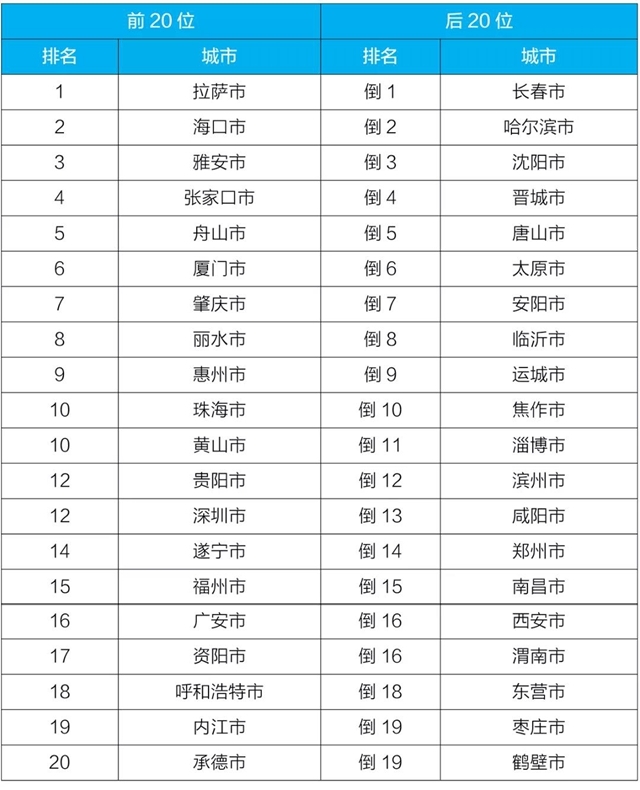 4月,168個(gè)重點(diǎn)城市中長(zhǎng)春、哈爾濱、沈陽(yáng)市等城市空氣質(zhì)量相對(duì)較差(從倒數(shù)第1名至并列倒數(shù)第19名);拉薩、??凇⒀虐彩械瘸鞘锌諝赓|(zhì)量相對(duì)較好(從第1名至第20名,見(jiàn)附表5)。